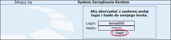 Przechodzimy do Systemu Zarządzania Kontem i logujemy się przy pomocy uzyskanego loginu oraz hasła. Operację zatwierdzamy przyciskiem Wejdź: